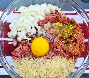 Mom’s Famous Stuffed Bell Peppers Ingredients: 6 large red or green bell peppers 2 1⁄2 cups long-grain white rice 2 lbs lean ground beef 1 medium sweet onion, diced 3 cups sharp cheddar cheese, grated 1⁄2 teaspoon pepper 1 teaspoon salt 1 teaspoon chicken seasoning (we use Vegeta) 1 egg 2 1⁄2 cups tomato juice 1⁄2 teaspoon pepper 1 teaspoon salt 6 bay leaves 2 tbsp vegetable oil 1 tbsp all-purpose flour