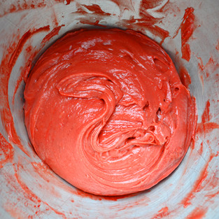 1. In a medium pot, bring the buttermilk, salt, and butter to a simmer on medium heat. Add the flour, cocoa powder, and powdered coloring to the milk mixture, and with a wooden spoon or spatula, stir very quickly.